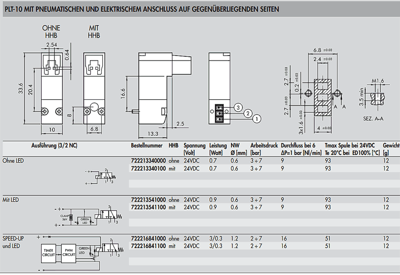 Magnetventile PLT-10 sind ein weiterer Beitrag zur Miniaturisierung, Leistungserhöhung, Energieeinsparung und erhöhter Zuverlässigkeit in der Pneumatik. In dieser Bauform nach ISO 15218 gibt es eine Vielzahl von verschiedenen Varianten. Die Leistung zur Betätigung der PLT-10-Ventile wurde mit 0.3 bis 0.8 Watt stark reduziert. Eine LED-Funktionsanzeige kann auf Wunsch integriert sein. Eine monostabile (tastende) Handhilfsbetätigung ist ebenfalls als Variante integrierbar. Verpolsicherheit ist gegeben, so dass keine Schäden bei versehentlichem Vertauschen der Polarität auftreten können.